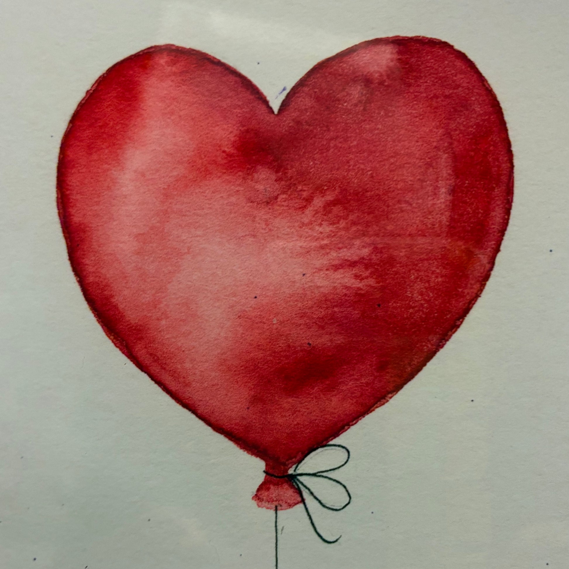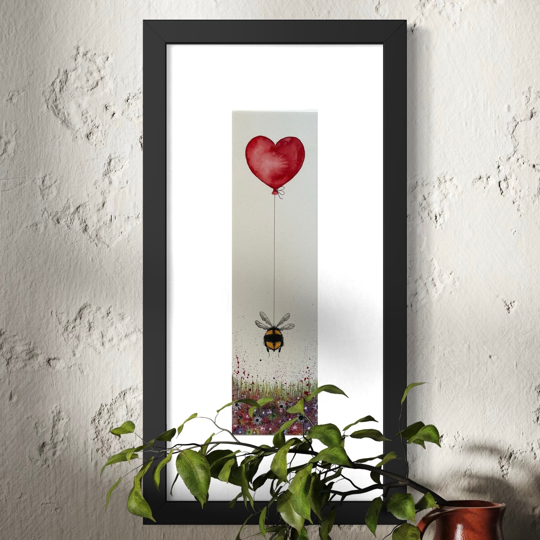 A bee floats upwards. Tied to a heart shaped balloon, embodying a blend of nature and fantasy. Signed by the artist. Size 100mm x 380mm plus border.