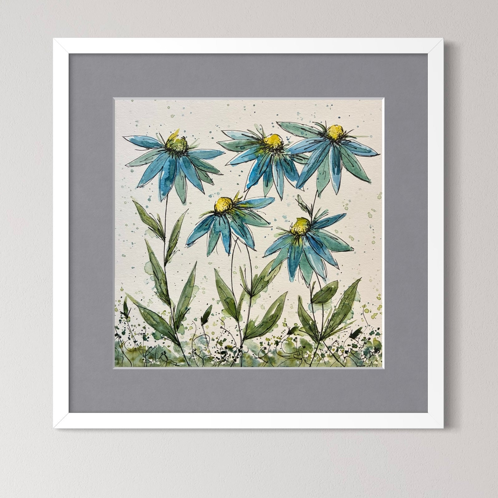 Blue daisy print taken from an original watercolour and pen design. Signed by the artist. Print size 210mm x 210mm plus border. Makes a great set of 3 combined with Foxgloves and Flutter-by.