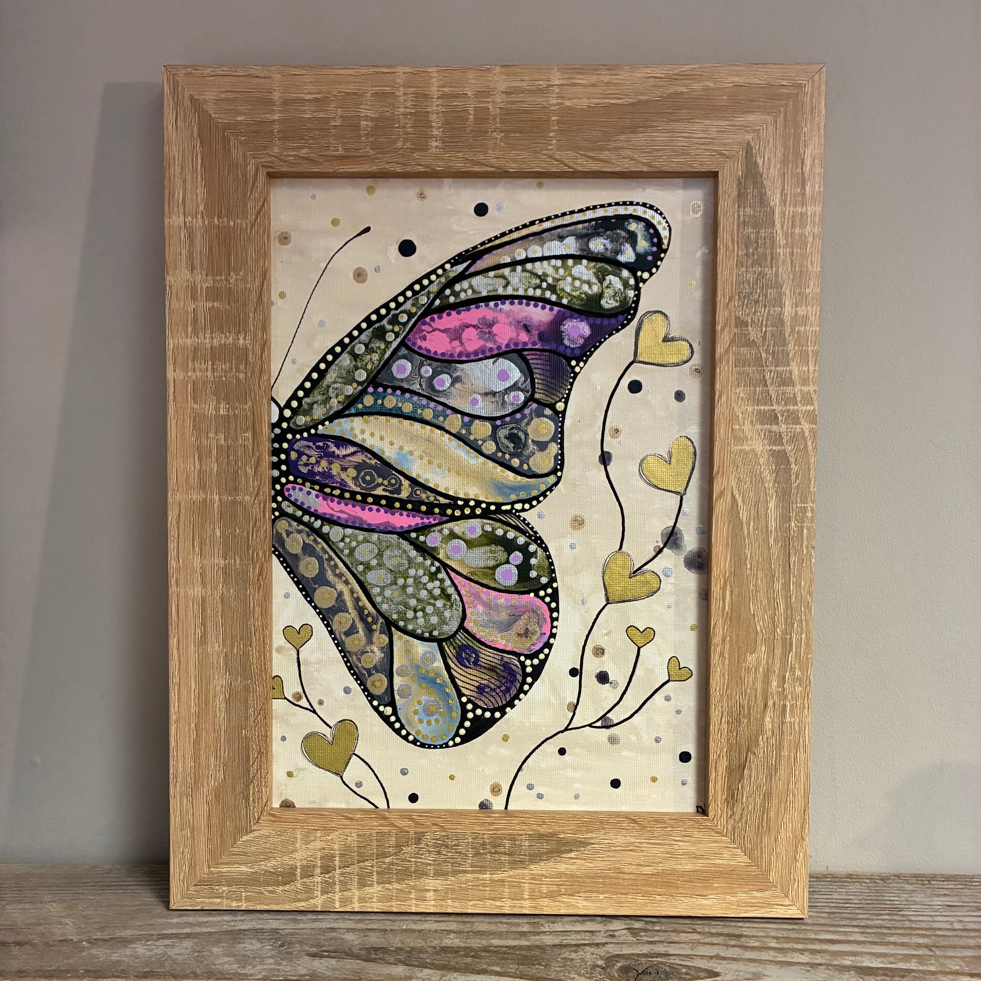 Butterfly original acrylic on canvas board complete with hardwood frame. Signed by the artist. Size including frame 290mm x 375mm.