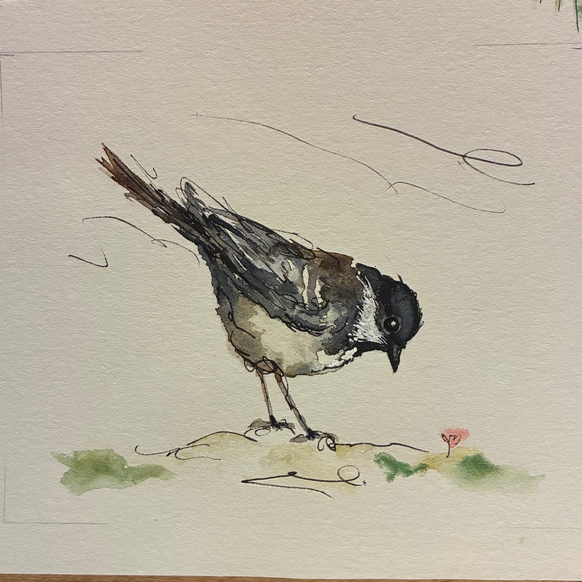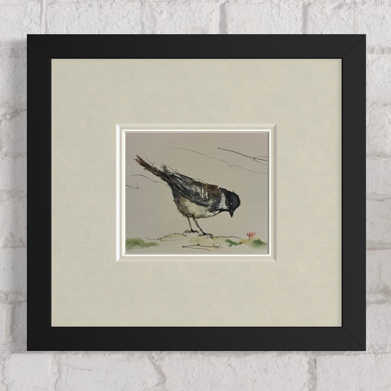 Print of a Coaltit foraging, taken from a loose pen and watercolour. Signed by the artists. Makes a great set with Robin & Wren. Size 165mm x 140mm plus border.