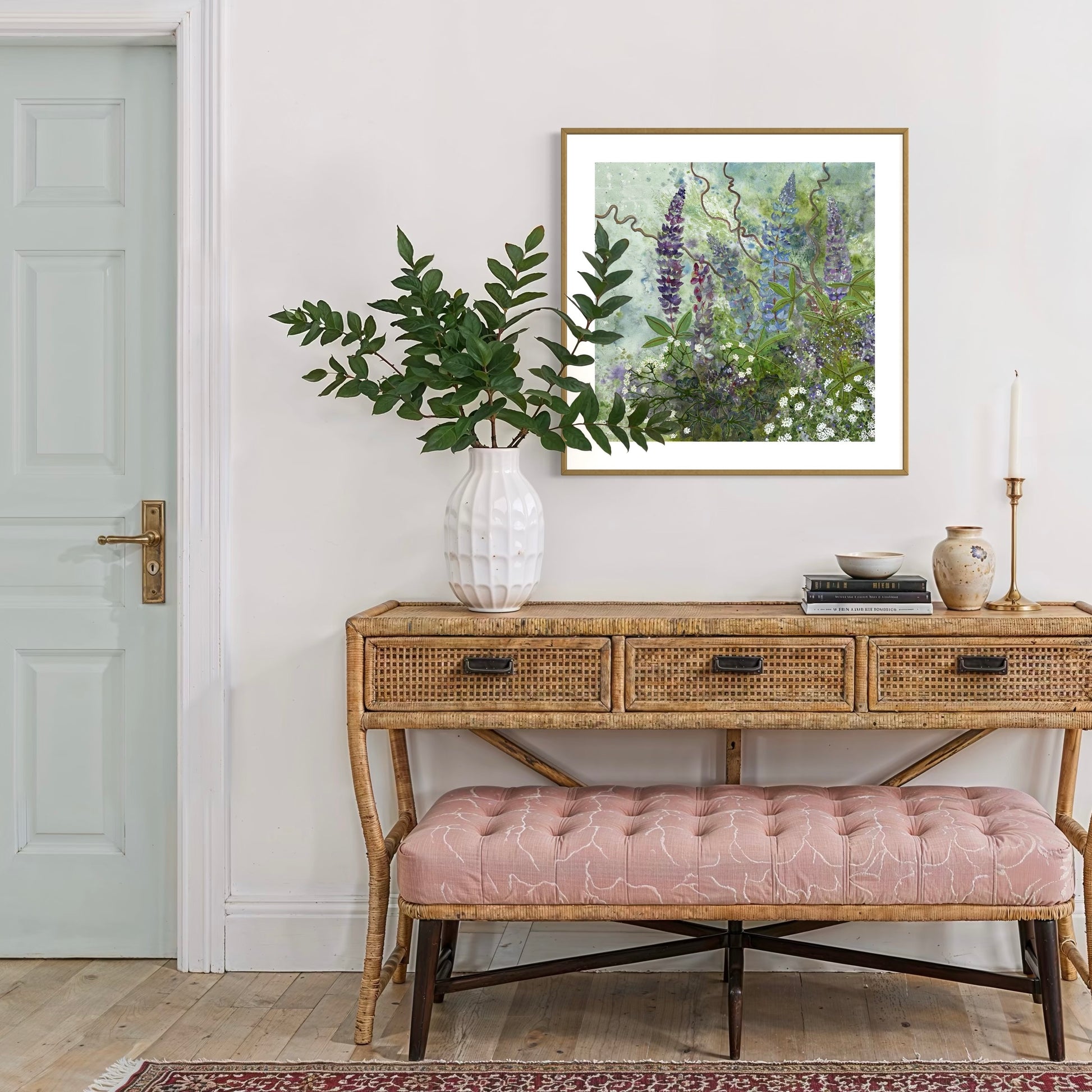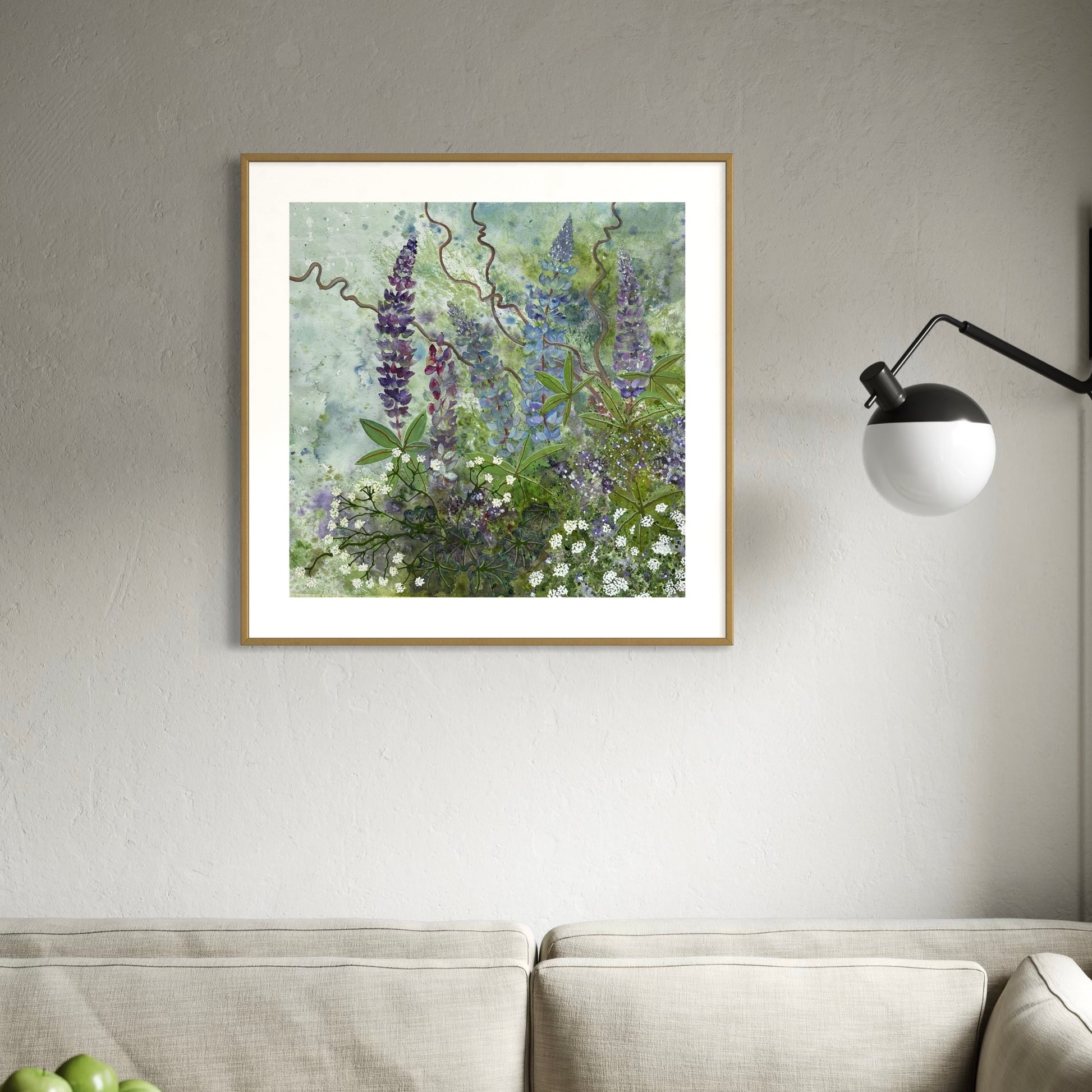 Original watercolour of Lupins in the garden. Wildflowers & tangled branches weave about the landscape. Signed by the artist. Size 560mm x 560 mm.