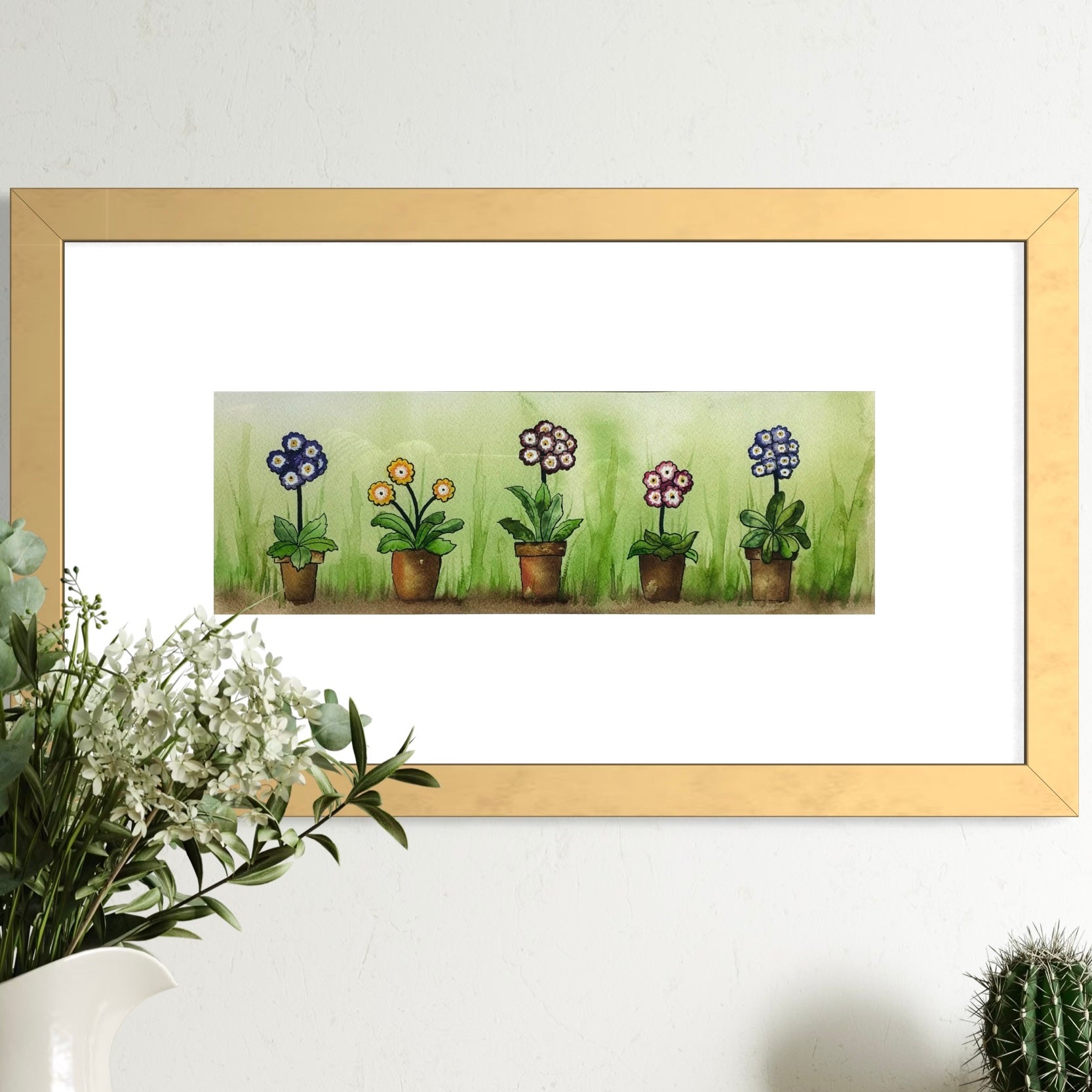 A charming row of colourful potted Auriculas against a soft green background. Signed by the artist. Size 340mm x 115mm plus border.