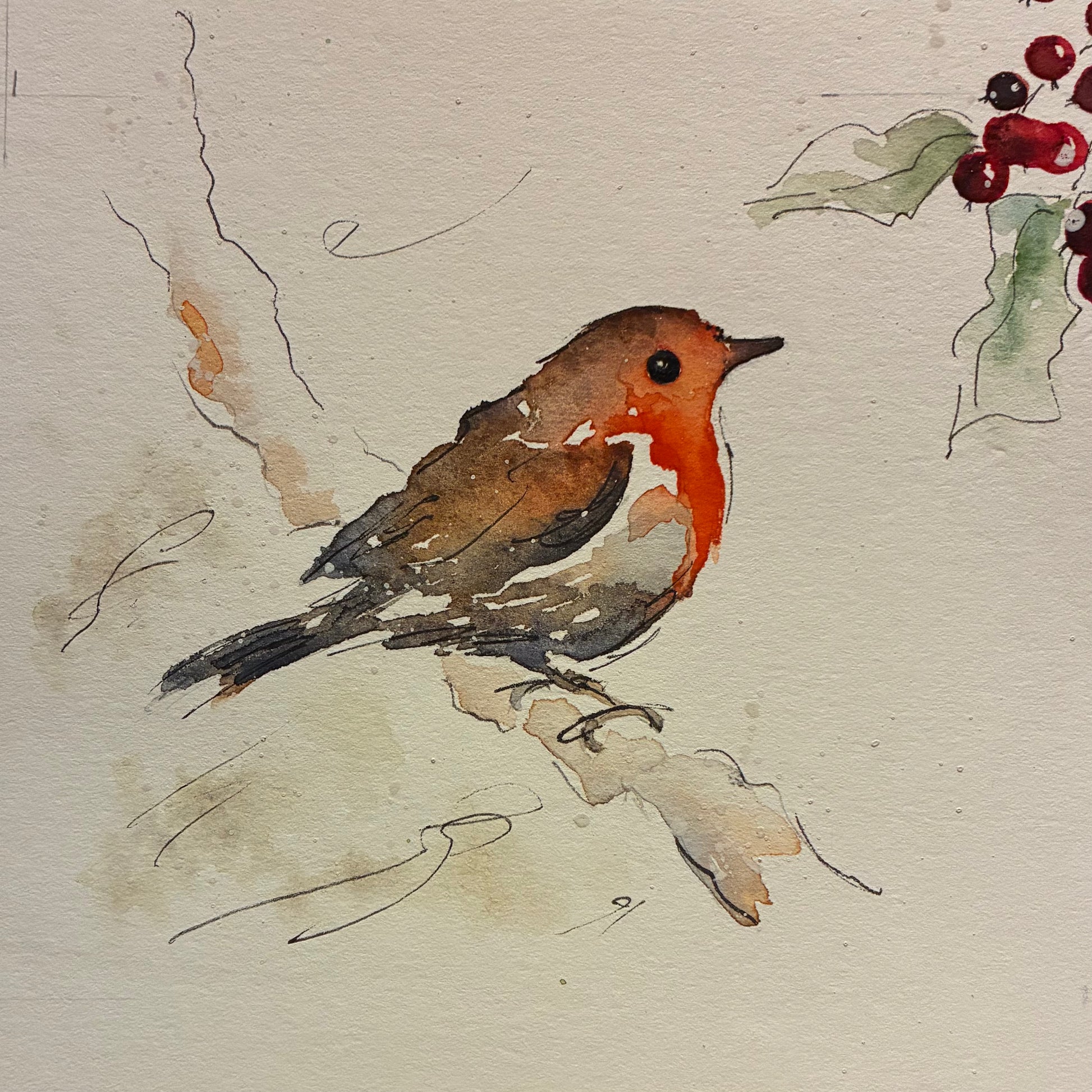 Print of a Robin on branch with holly & berries, taken from an original watercolour. Signed by the artists. Size 165mm x 140mm plus border.
