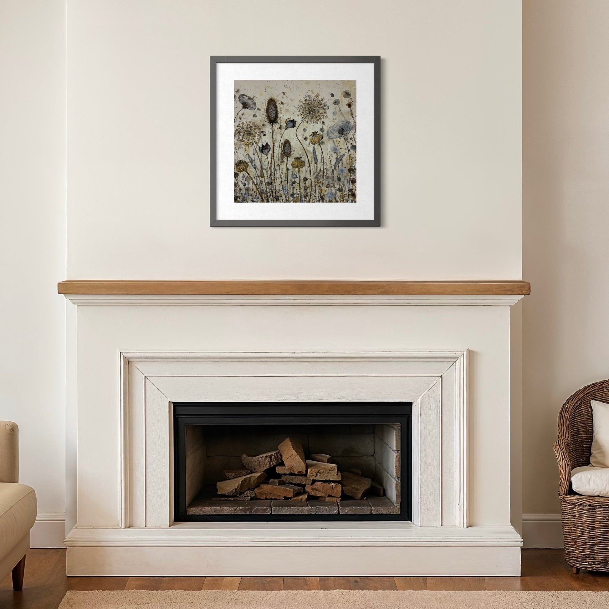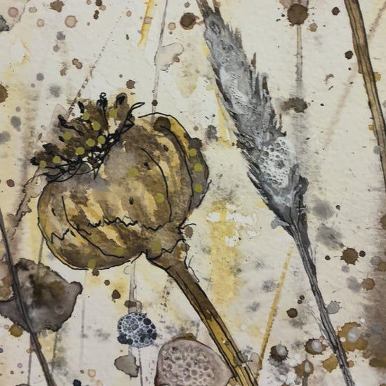 An original watercolour and pen by Deborah. Muted colours of taupes, greys and brown depictes teasels, poppy heads and grasses swaying in the breeze. Size 530mm x 530mm. Signed by the artist.