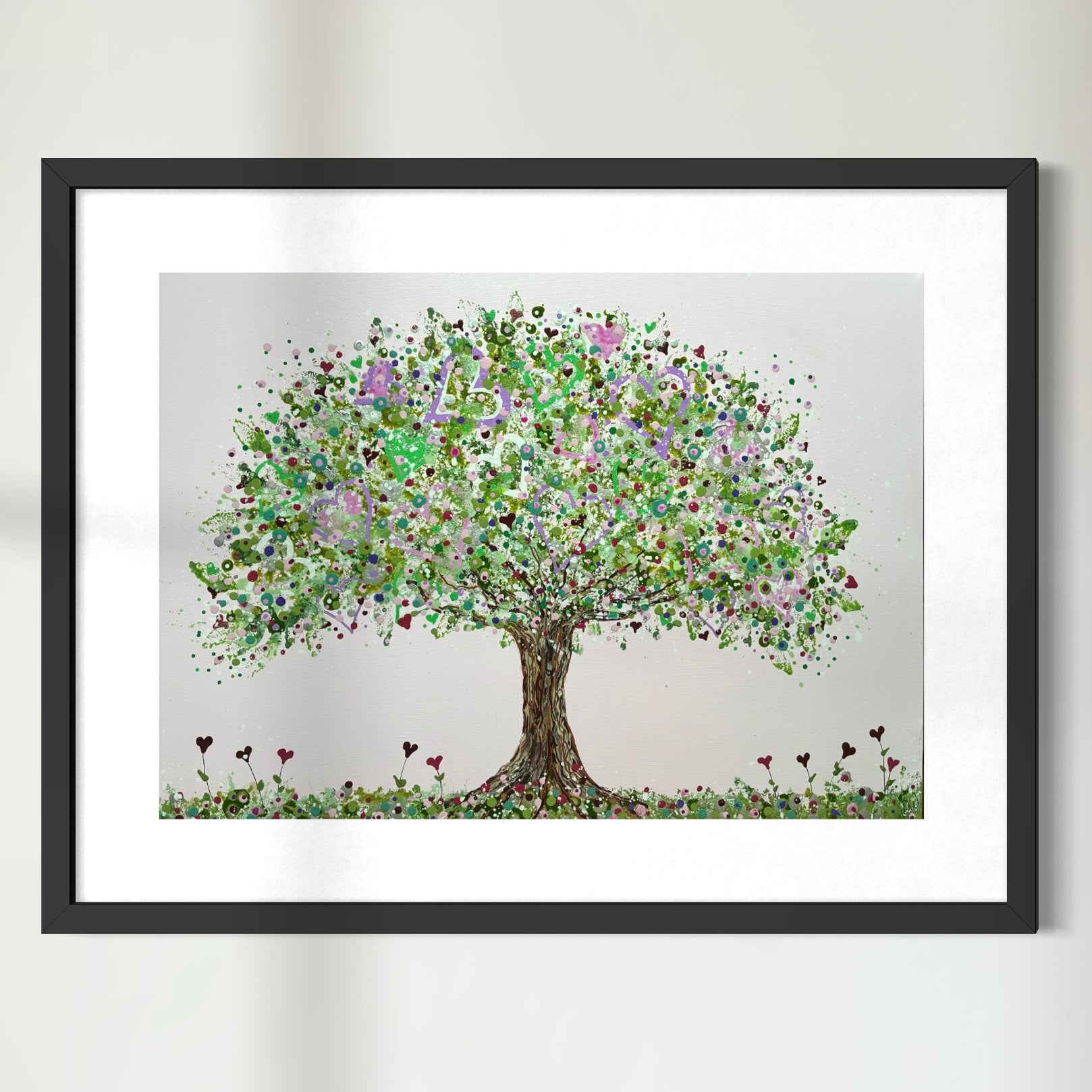 Original acrylic on canvas. A vibrant tree adorned with pink, lilac and silver hearts and foliage, symbolising love and nature’s beauty. Size of canvas 70cm x 50cm. Unframed